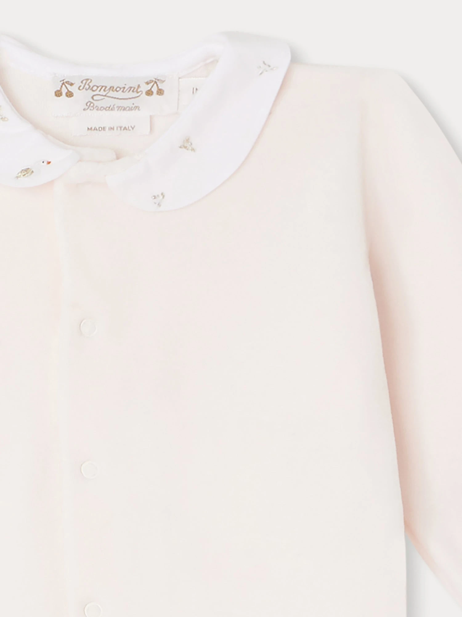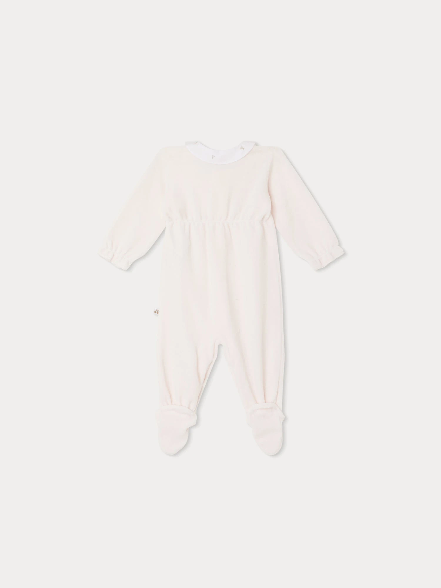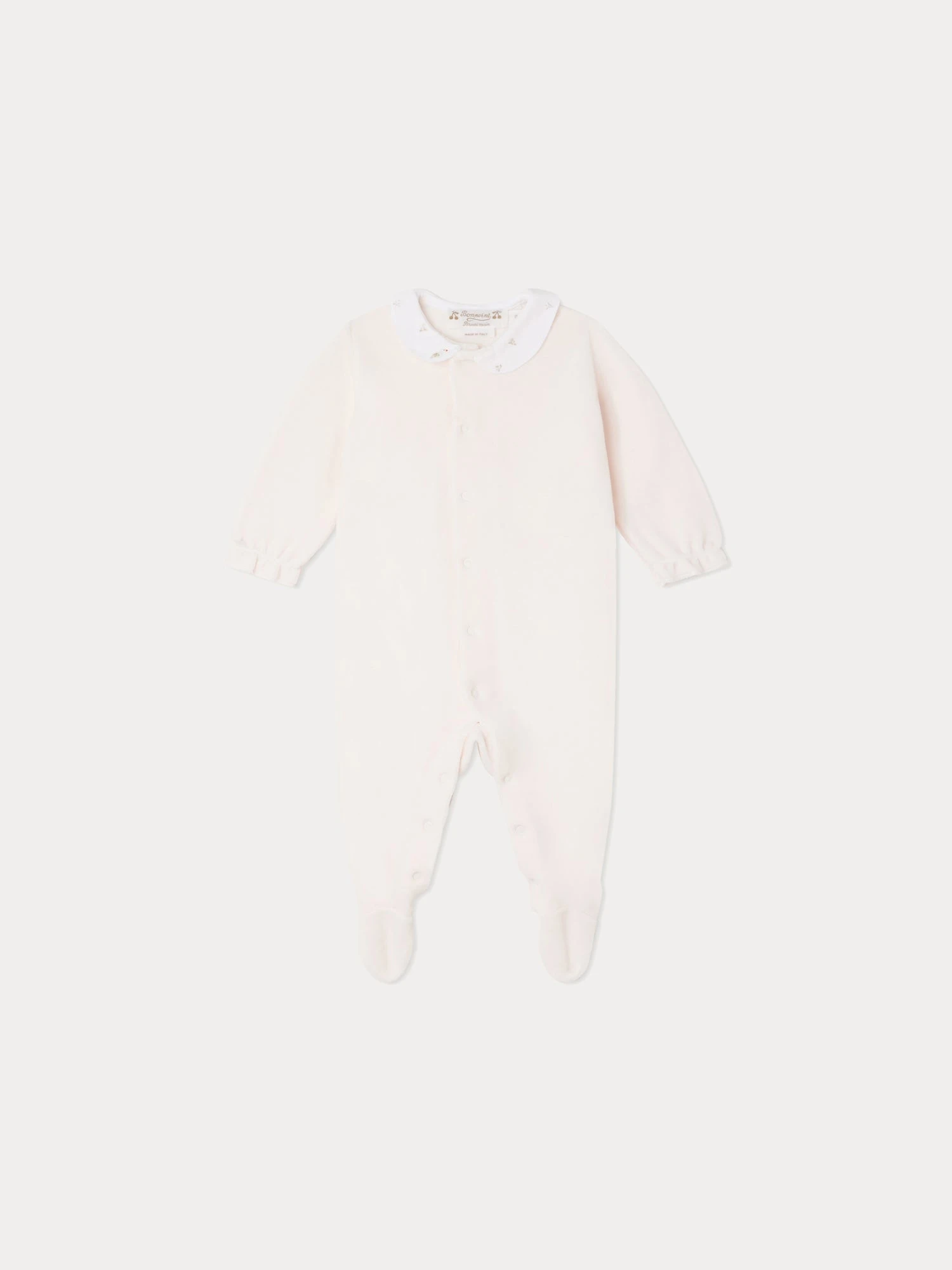 Avec sa forme intégrale, le pyjama Tintina garde les bébés au chaud jusqu’au bout des pieds. Son col Claudine contrastant se pare de motifs brodés à la main.