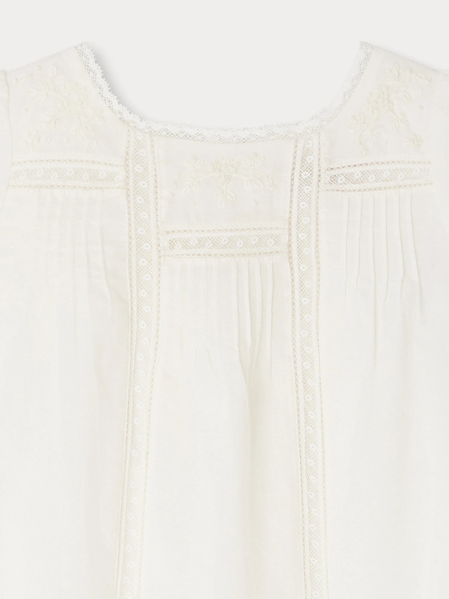 La robe Angeli pour bébé est coupée dans un voile de coton fluide d’une grande douceur. Ses détails en dentelle de Calais et ses broderies faites main lui assure un touche romantique.