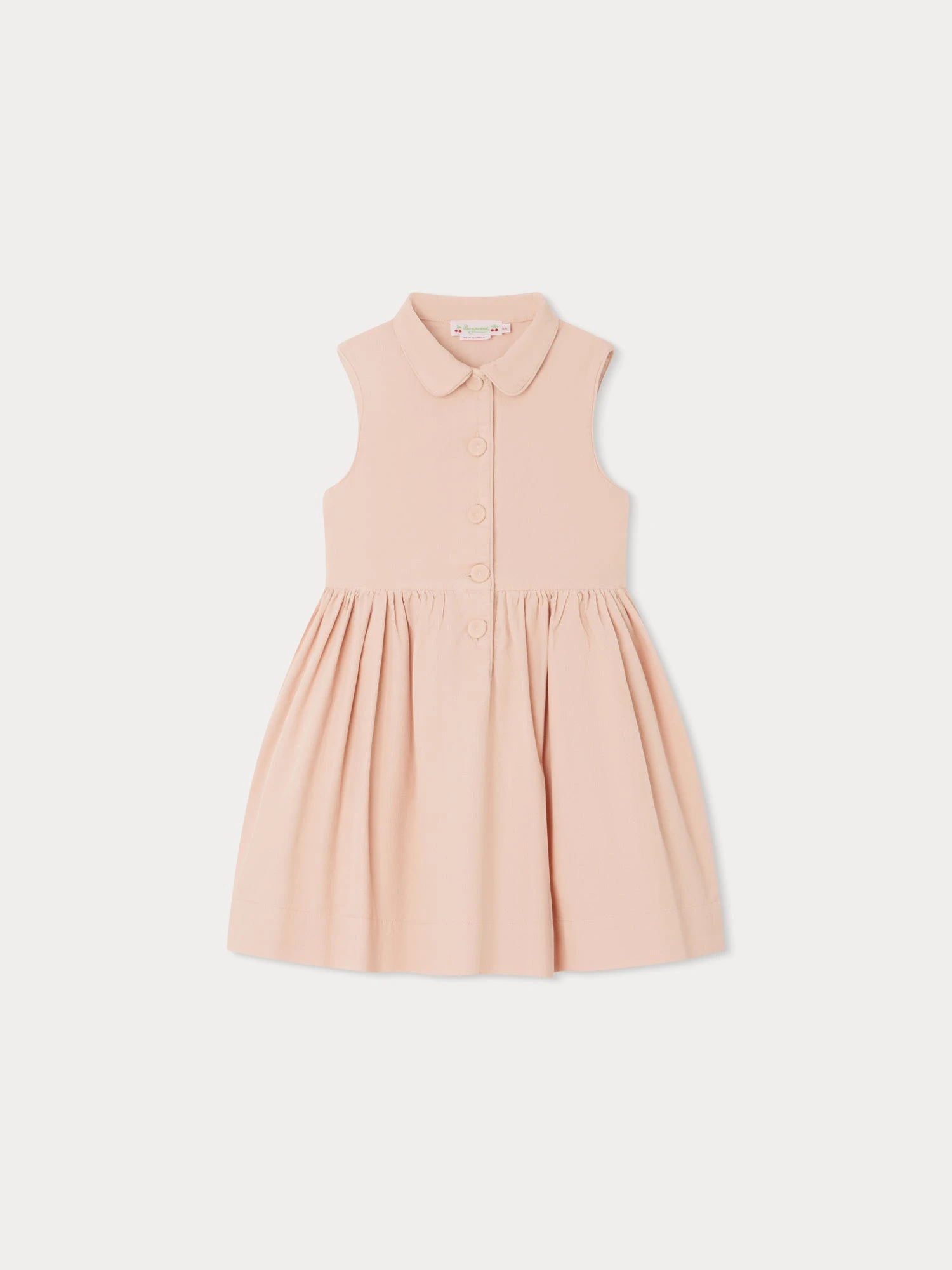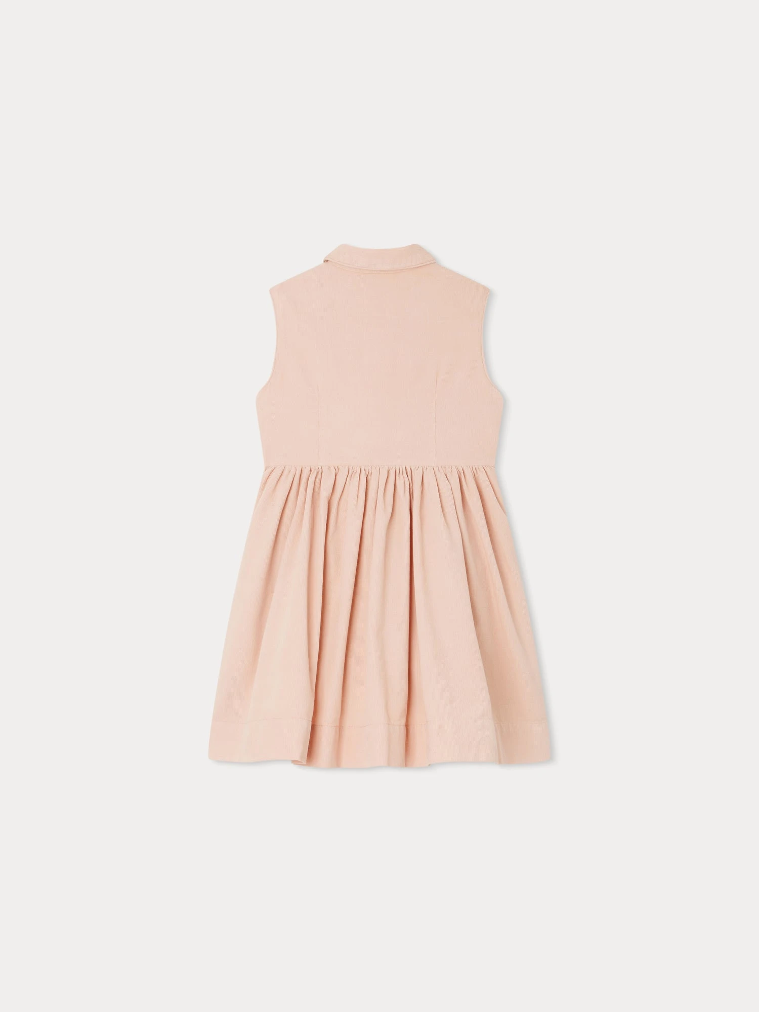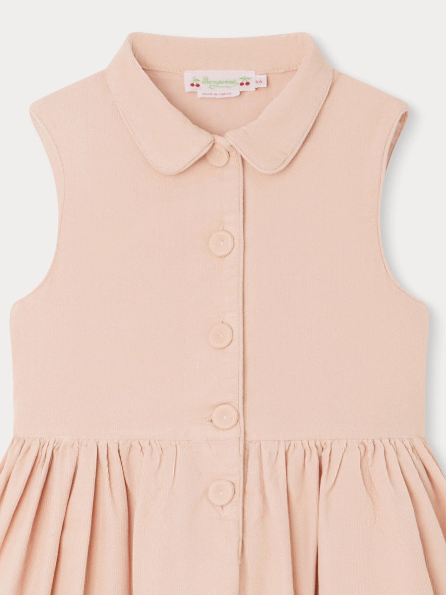 Confectionnée en velours milleraies certifié garantissant l’absence de résidus chimiques et toxiques, cette robe pour fille Anne séduit par son jeu de fronces sous la taille et son col élégant.