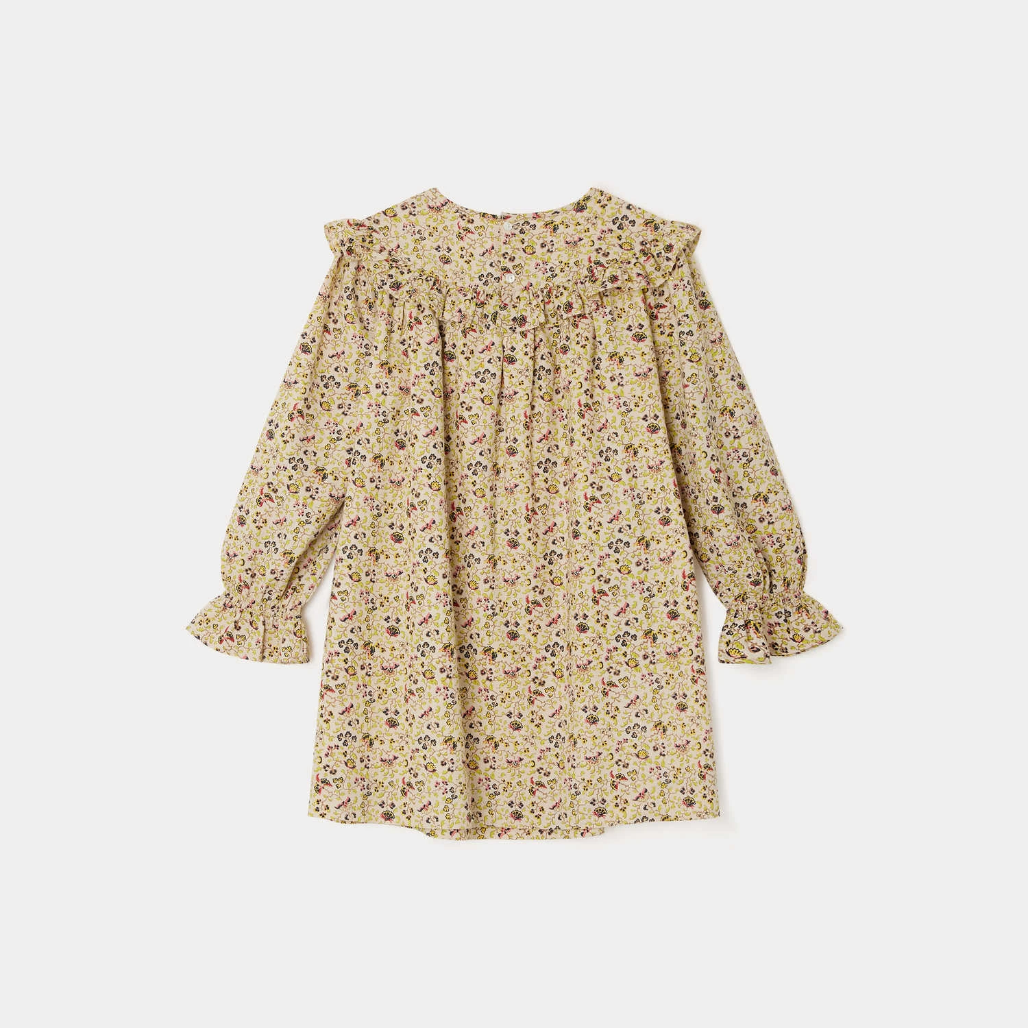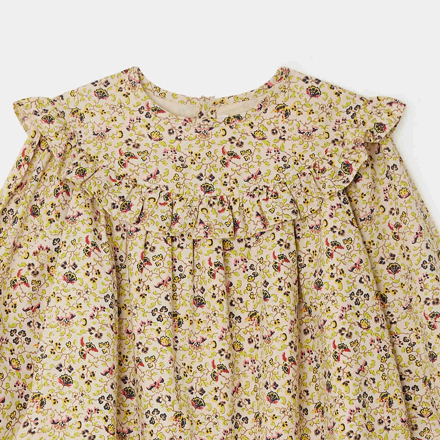 La robe Bevika pour fille se distingue par son plastron volanté, son imprimé fleuri et son joli volume. Les manches longues sont elles aussi décorées d’un volant au niveau des poignets.