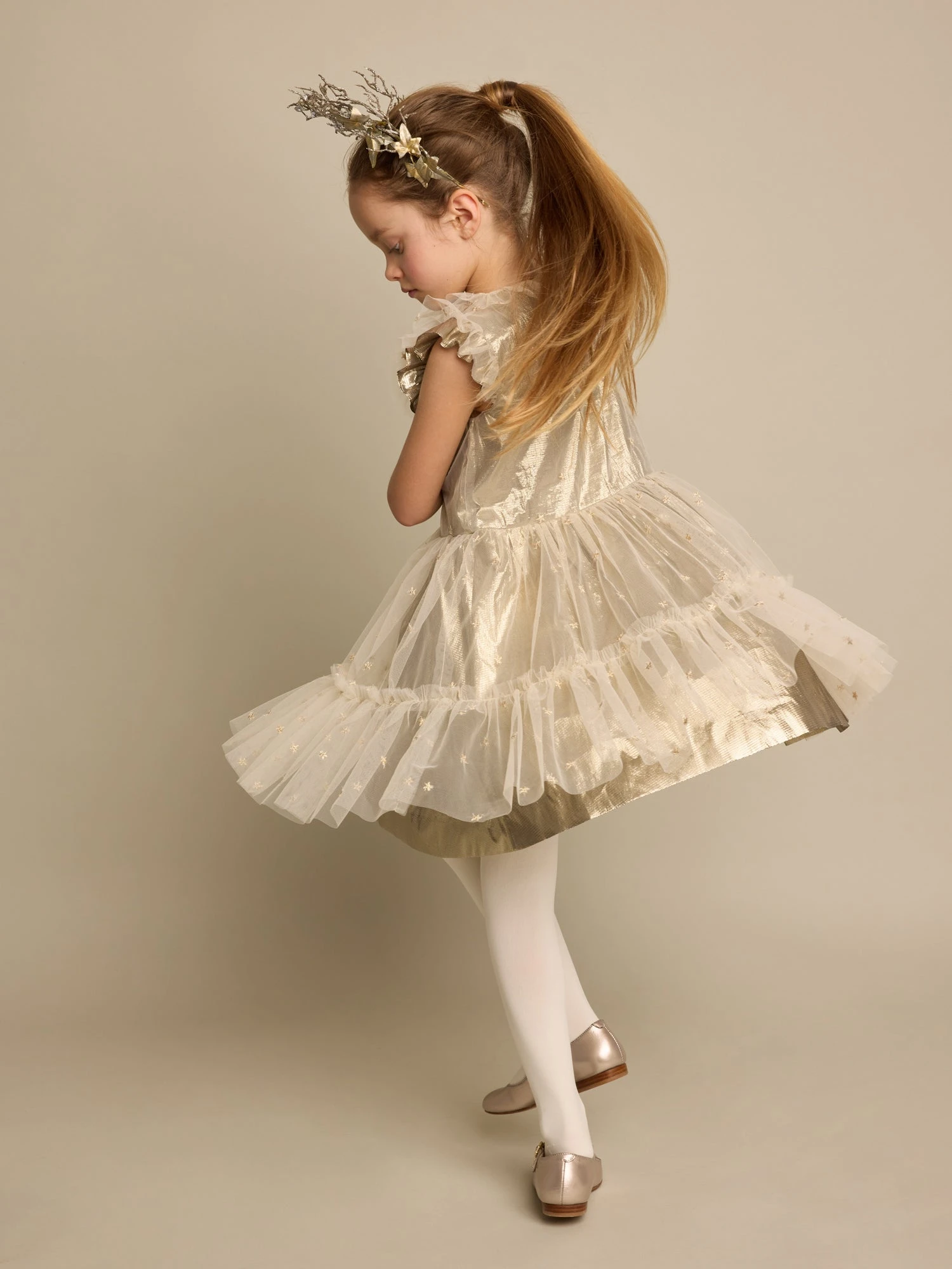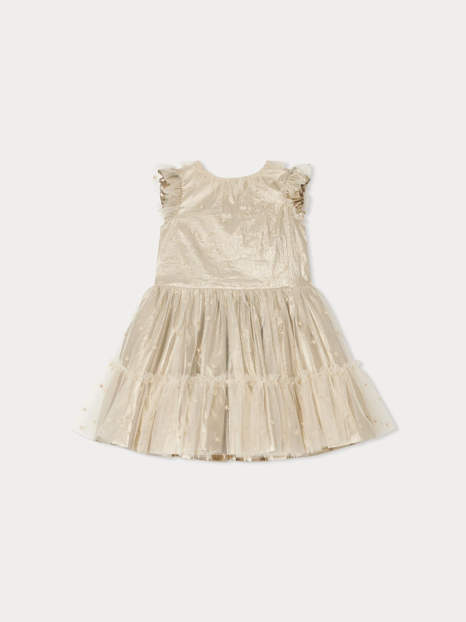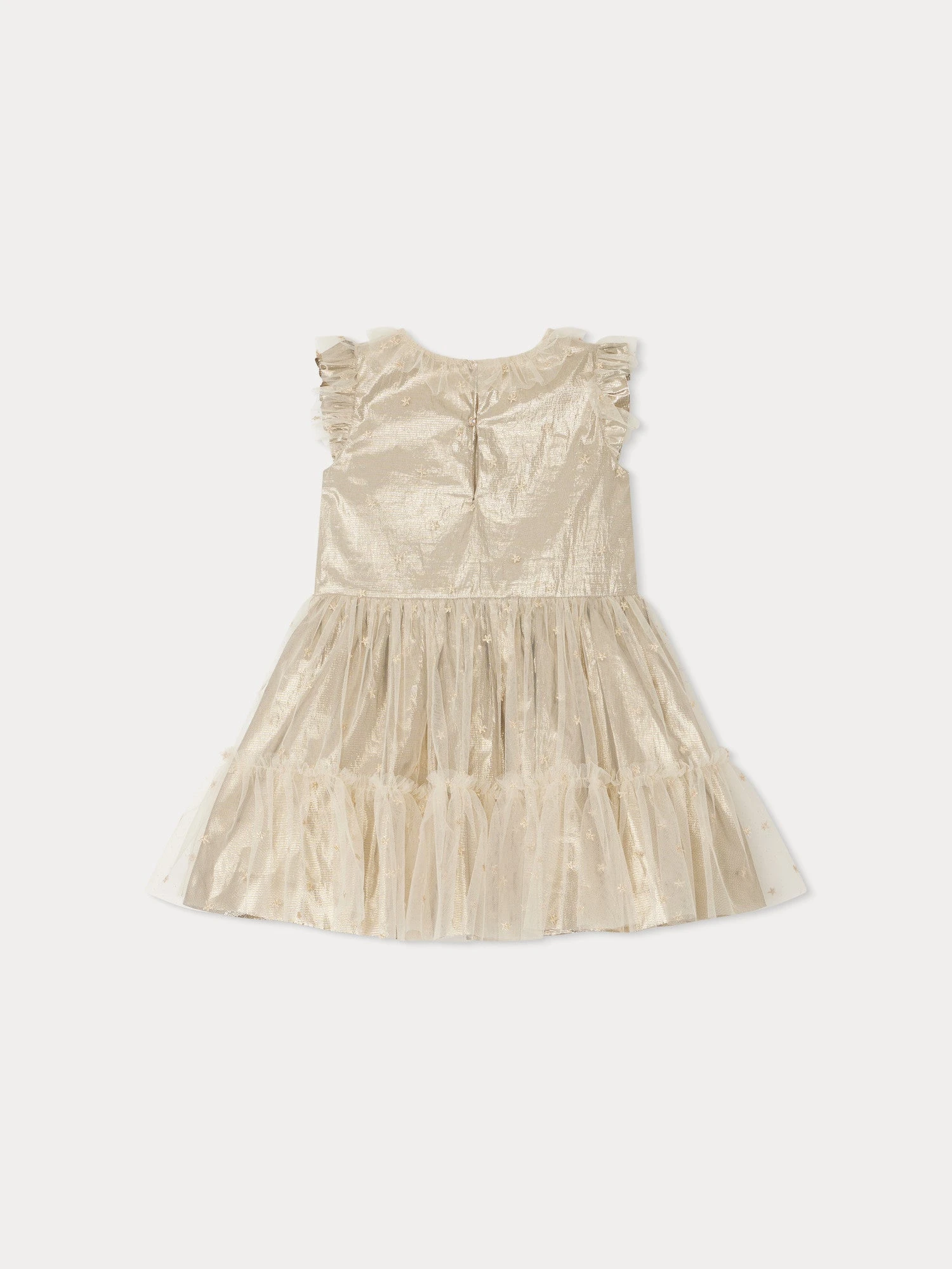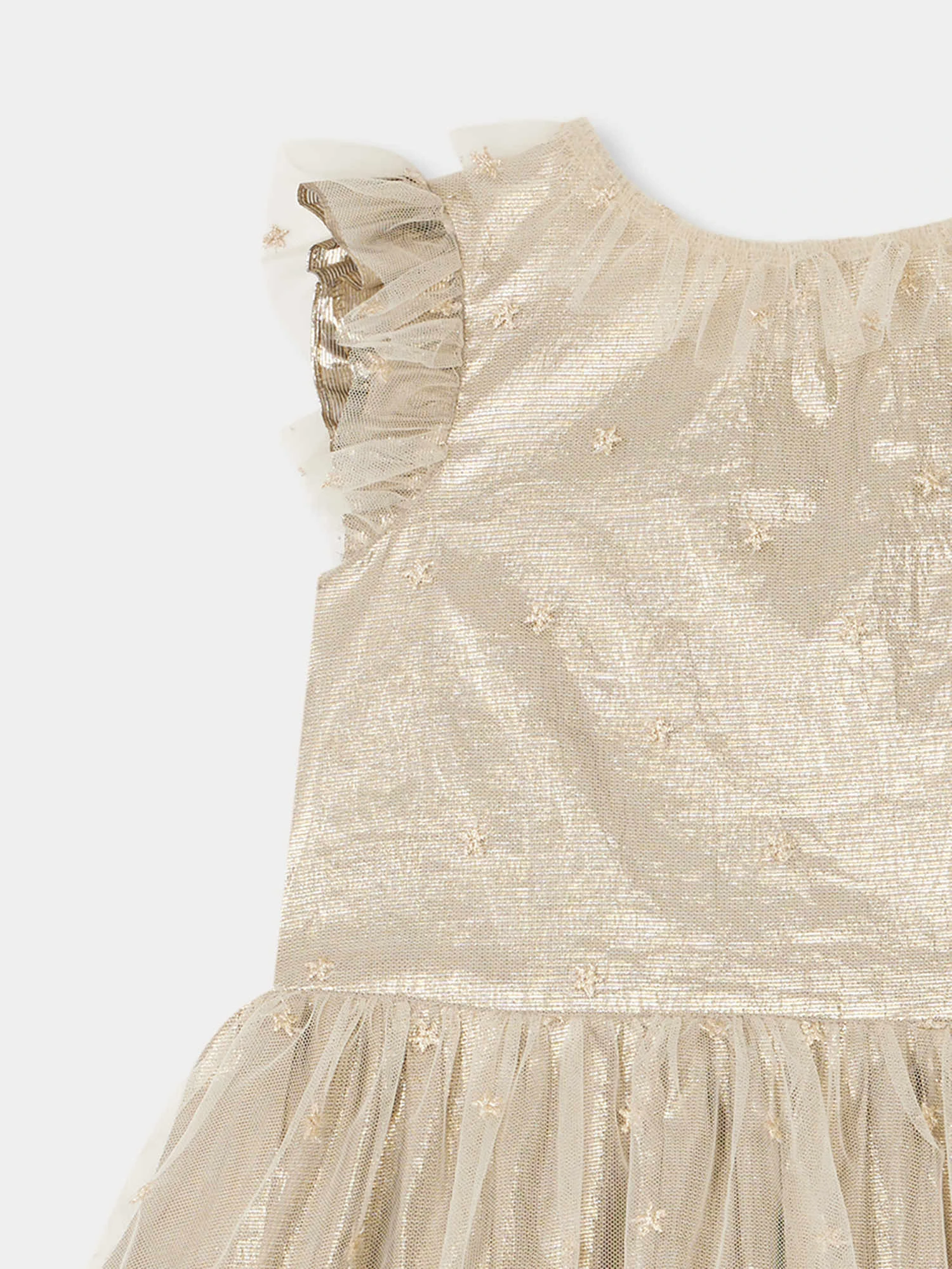 La robe Bonheur pour fille est pleine de féérie avec son tissu lamé, idéal pour les grandes occasions. Ce modèle à manches courtes est recouvert de tulle délicatement brodé d’étoiles.