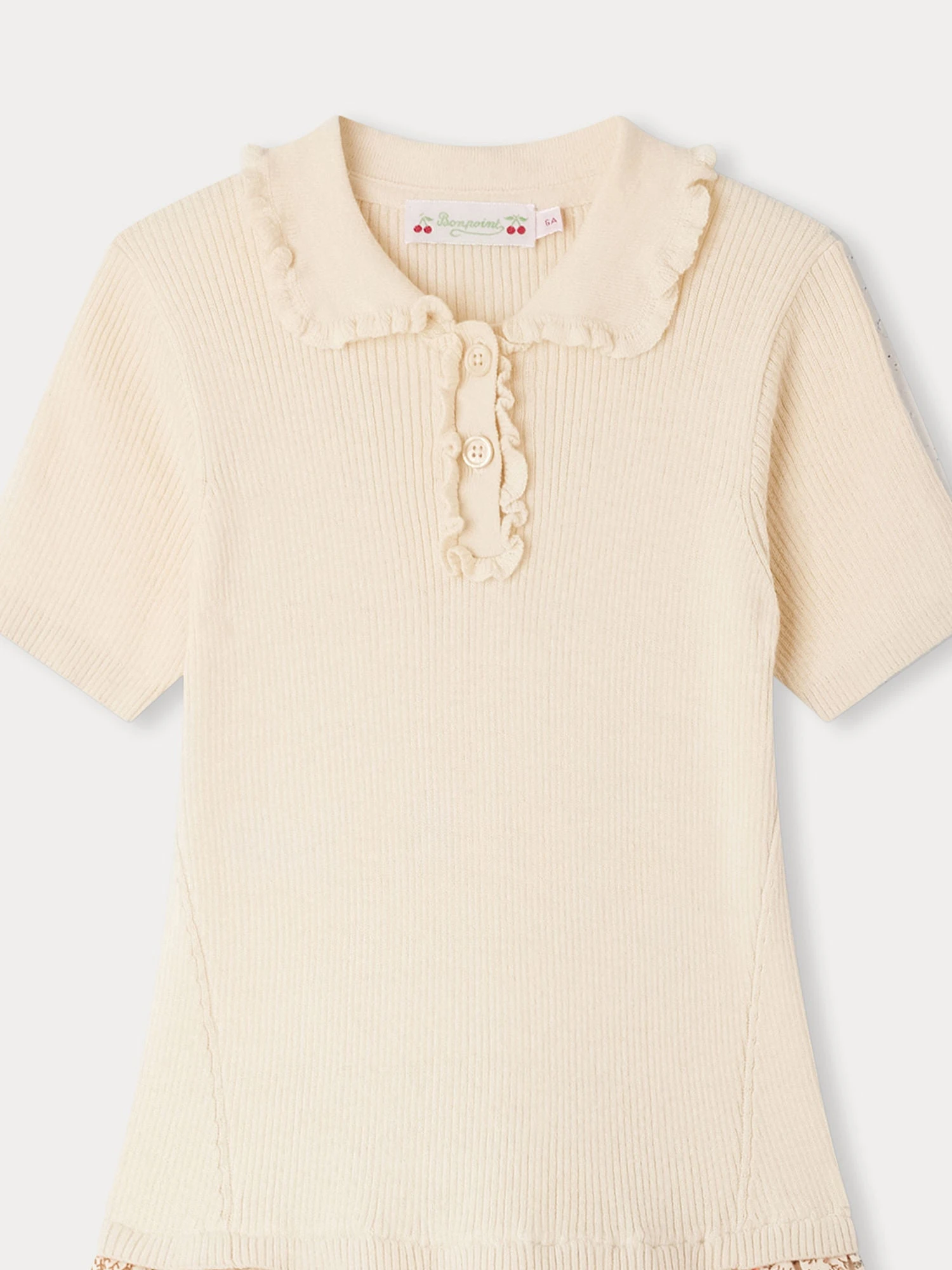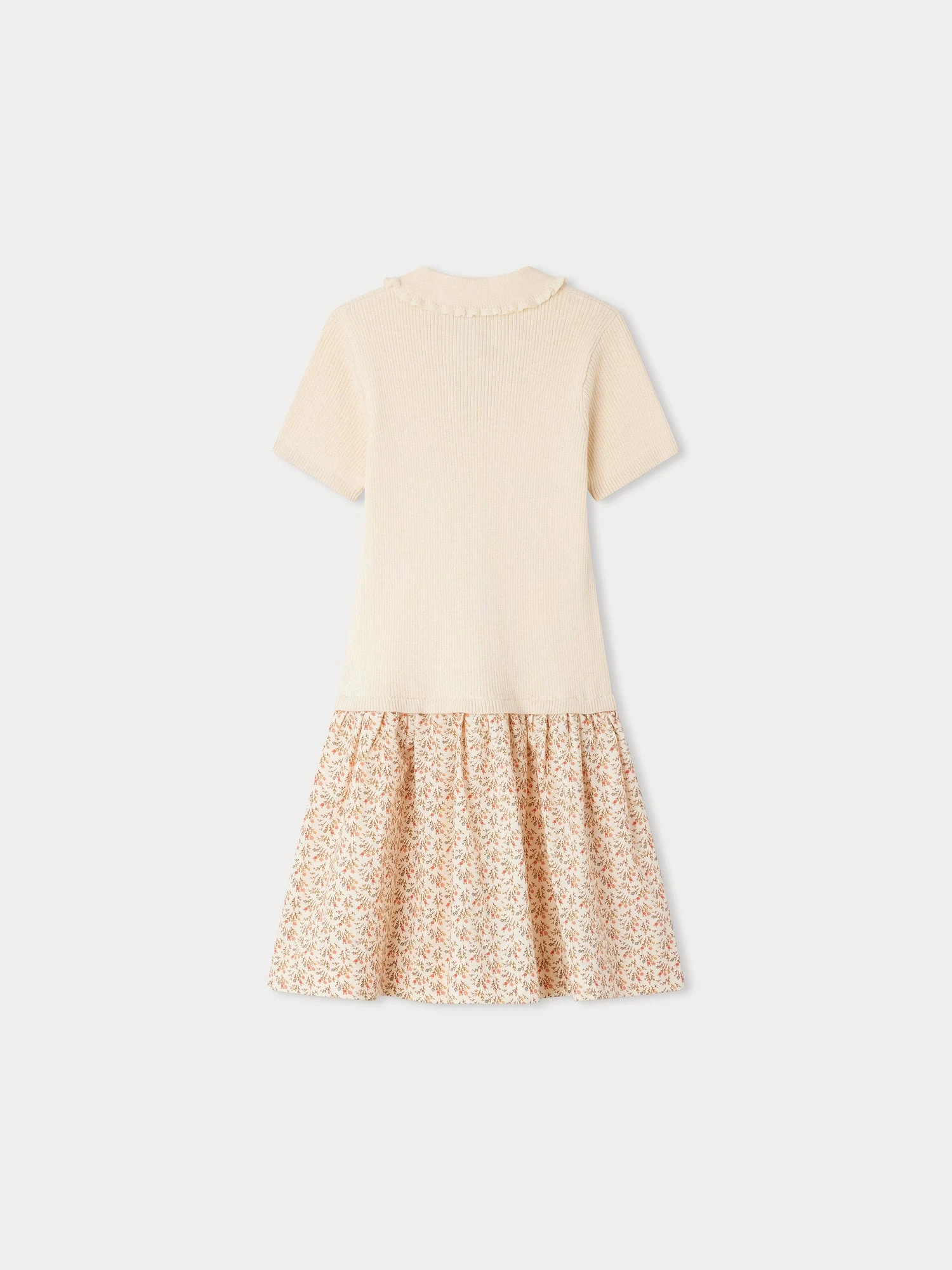 Confectionnée en coton biologique, la robe bimatière Clivia pour fille se compose d’un haut à manches courtes et d’une jupe en tissu floral froncé. Le col Claudine et la patte de boutonnage sont agrémentés de volants.