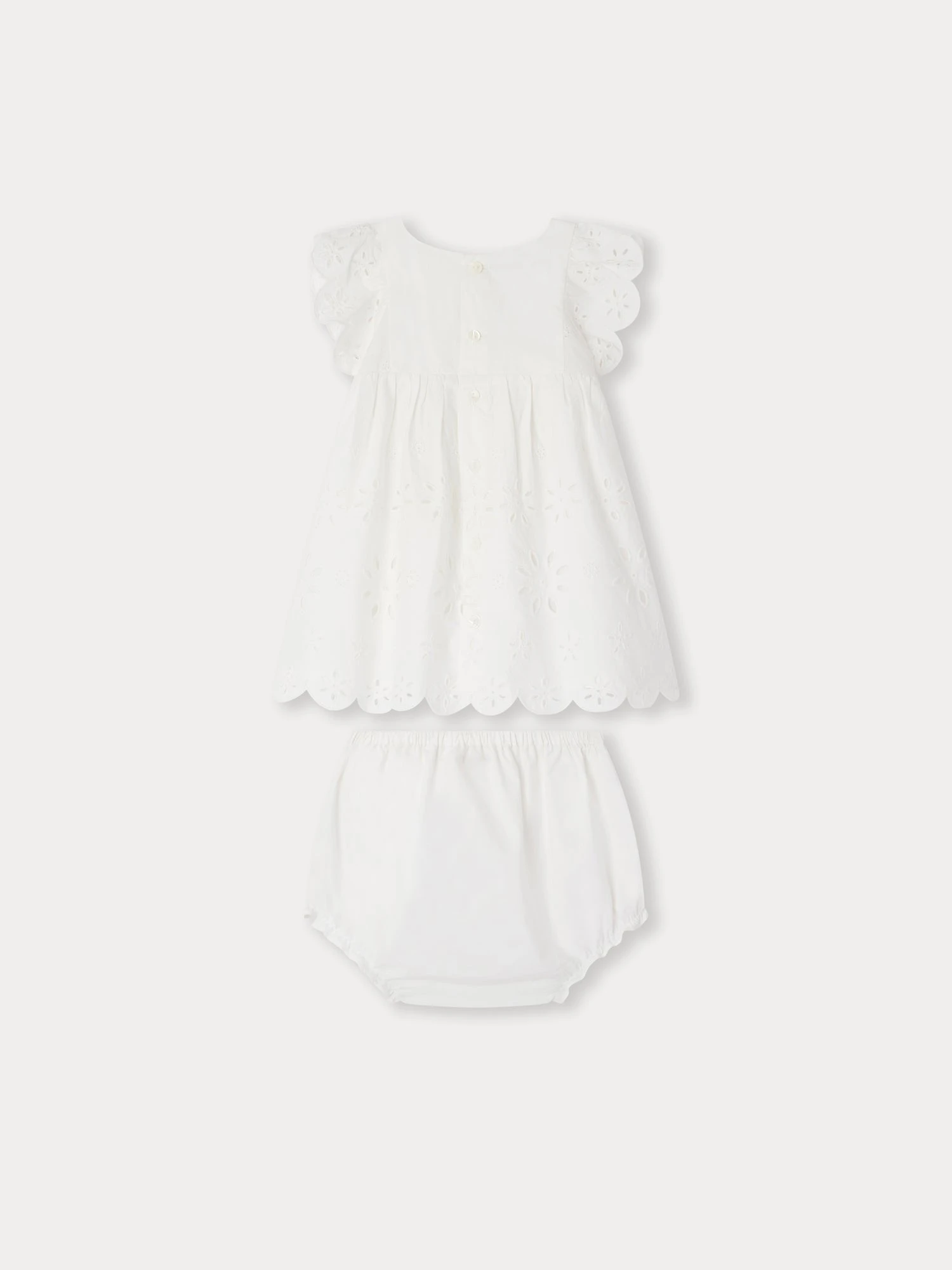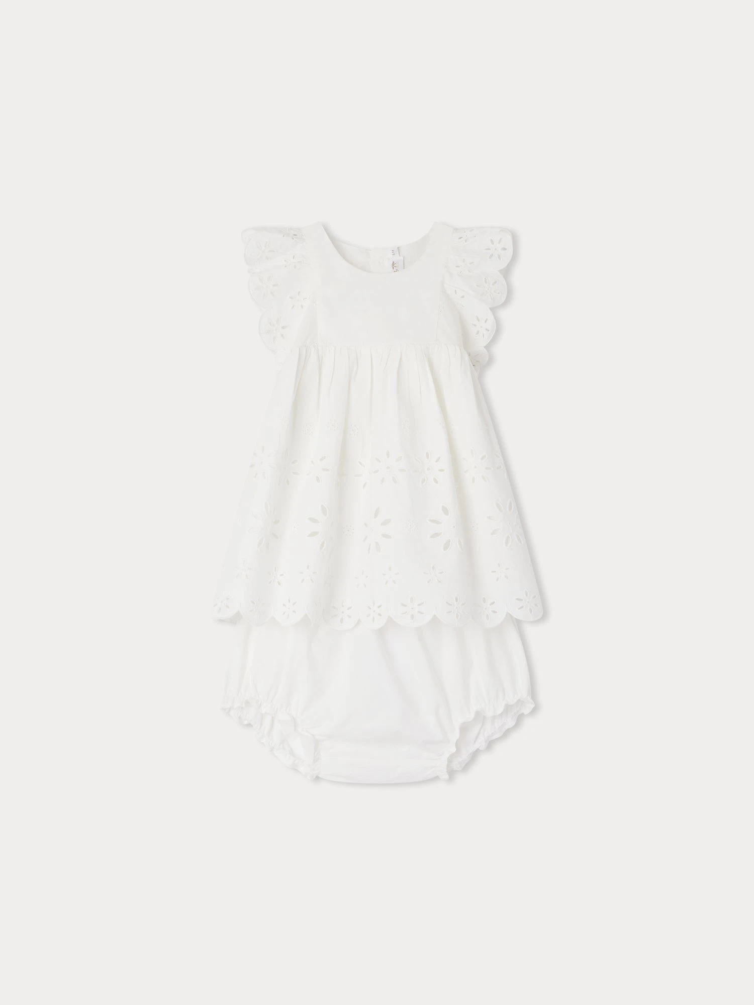 Tout en popeline agréable à porter, la robe Lulu pour bébé se caractérise par ses motifs en broderie anglaise. Ce modèle uni accompagné d’un bloomer assorti est idéal pour une cérémonie.