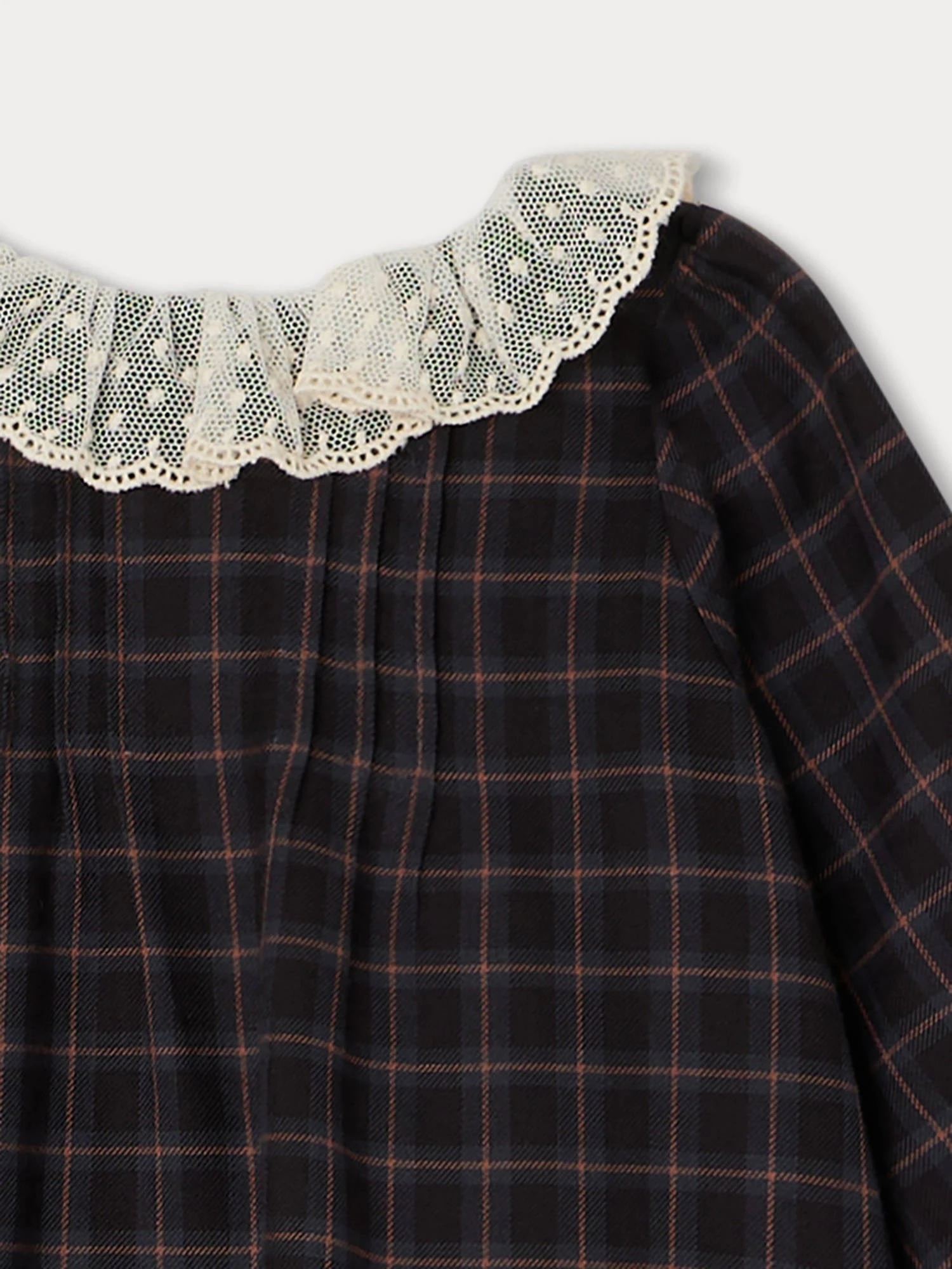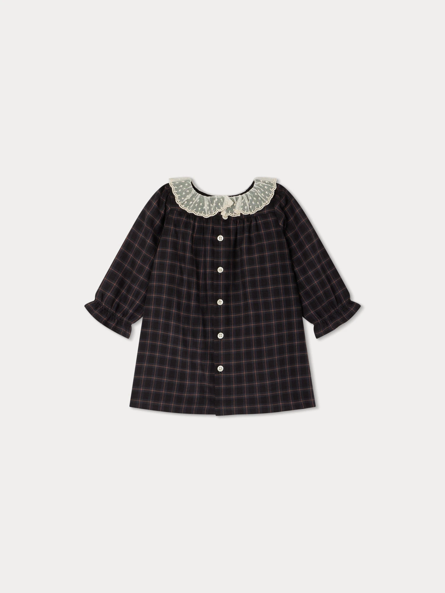 Cette robe pour bébé Magnolia se présente dans une coupe évasée confortable et se pare d’un motif à carreaux intemporel. Sa délicate collerette et ses poignets volantés lui confèrent tout son charme.