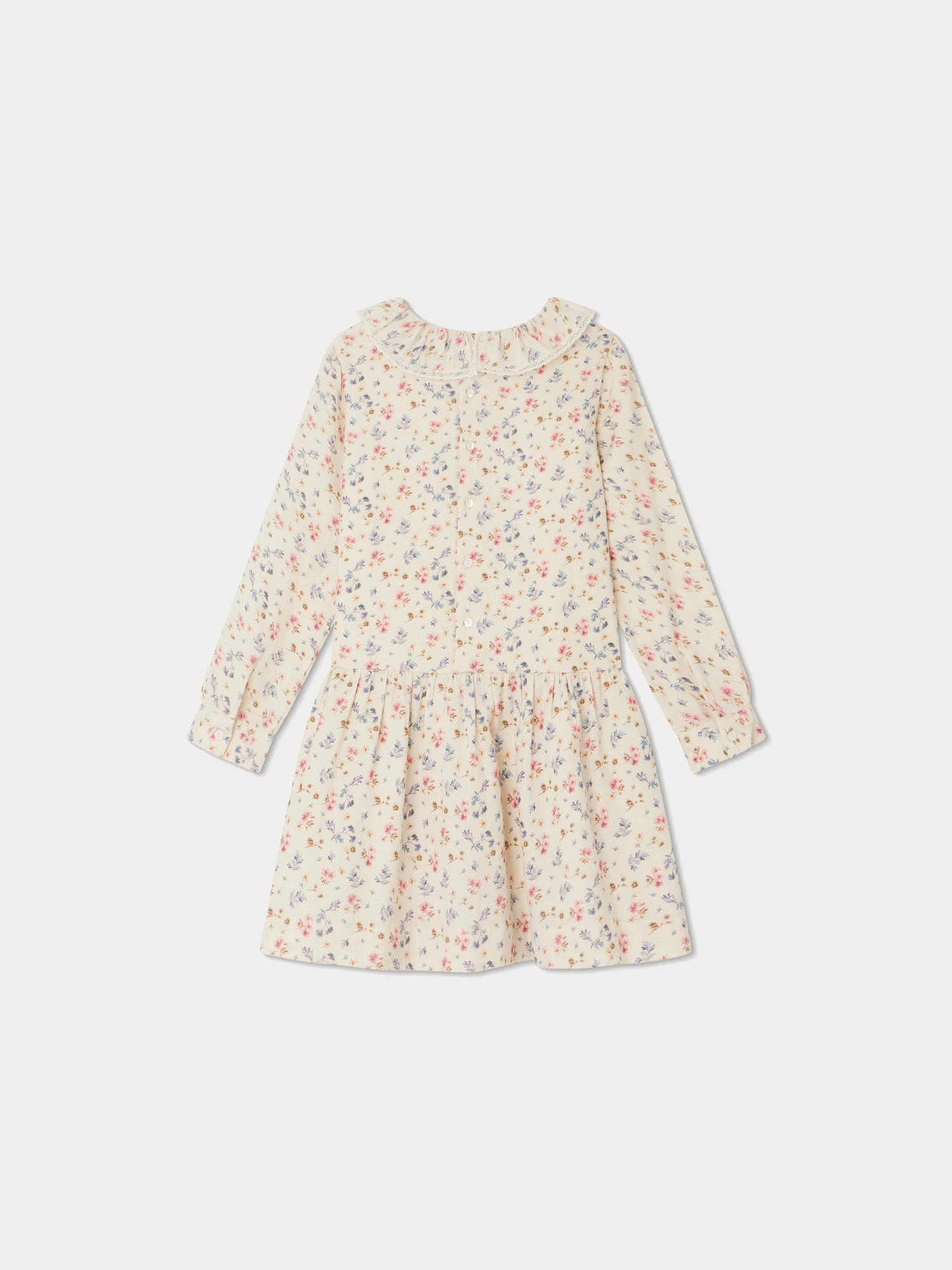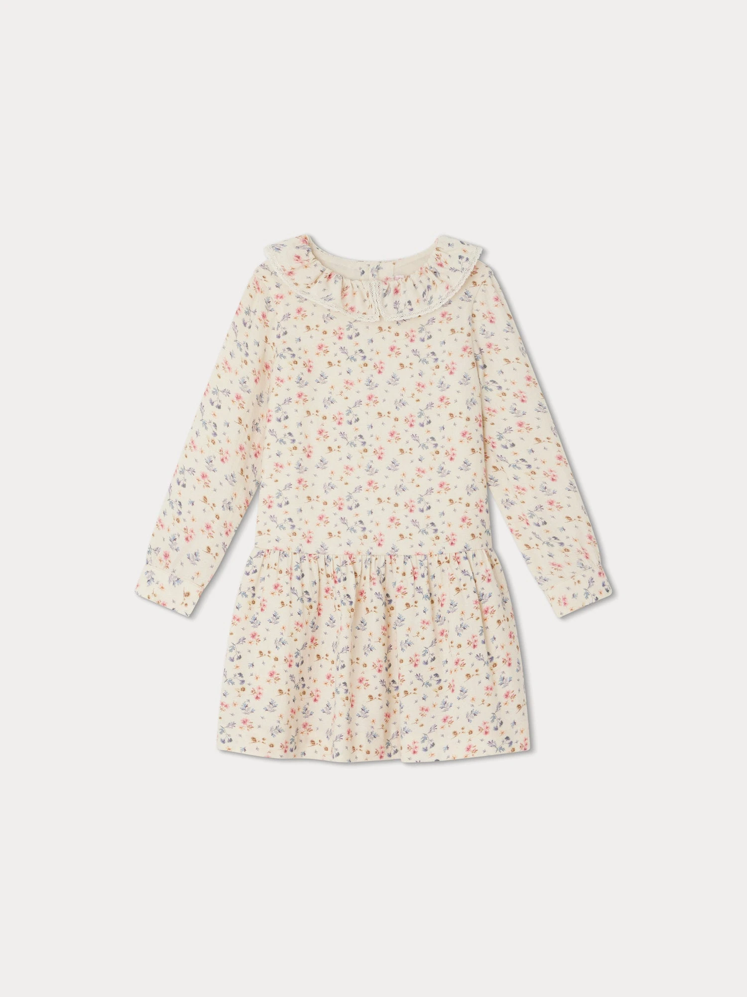La robe Mariela pour fille possède un charme poétique avec son imprimé intégral à petites fleurs. Sa collerette assortie est bordée de dentelle finement travaillée.