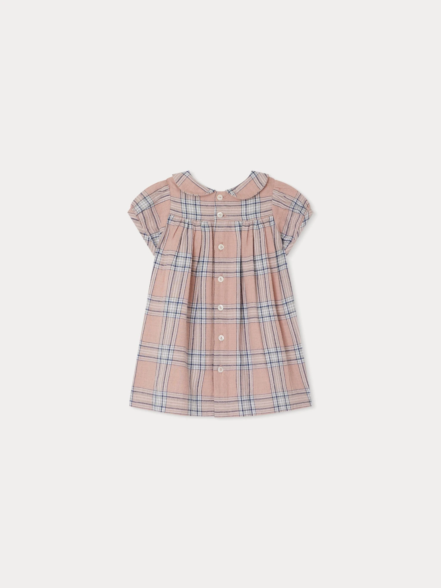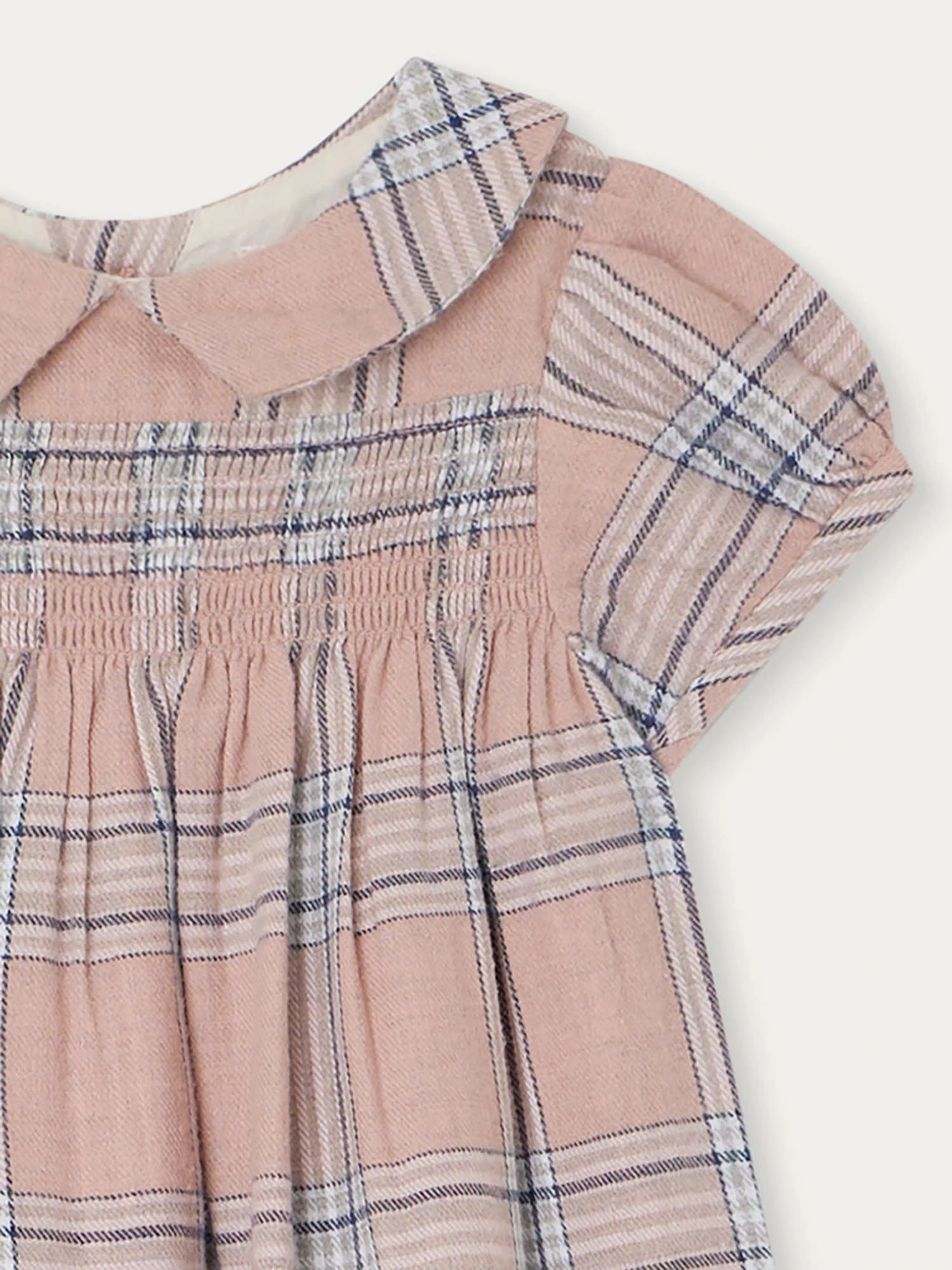 L’imprimé à carreaux colorés de la robe Joyeuse pour bébé est plein de grâce. Des smocks délicats s’invitent sur le buste et structurent la coupe évasée.