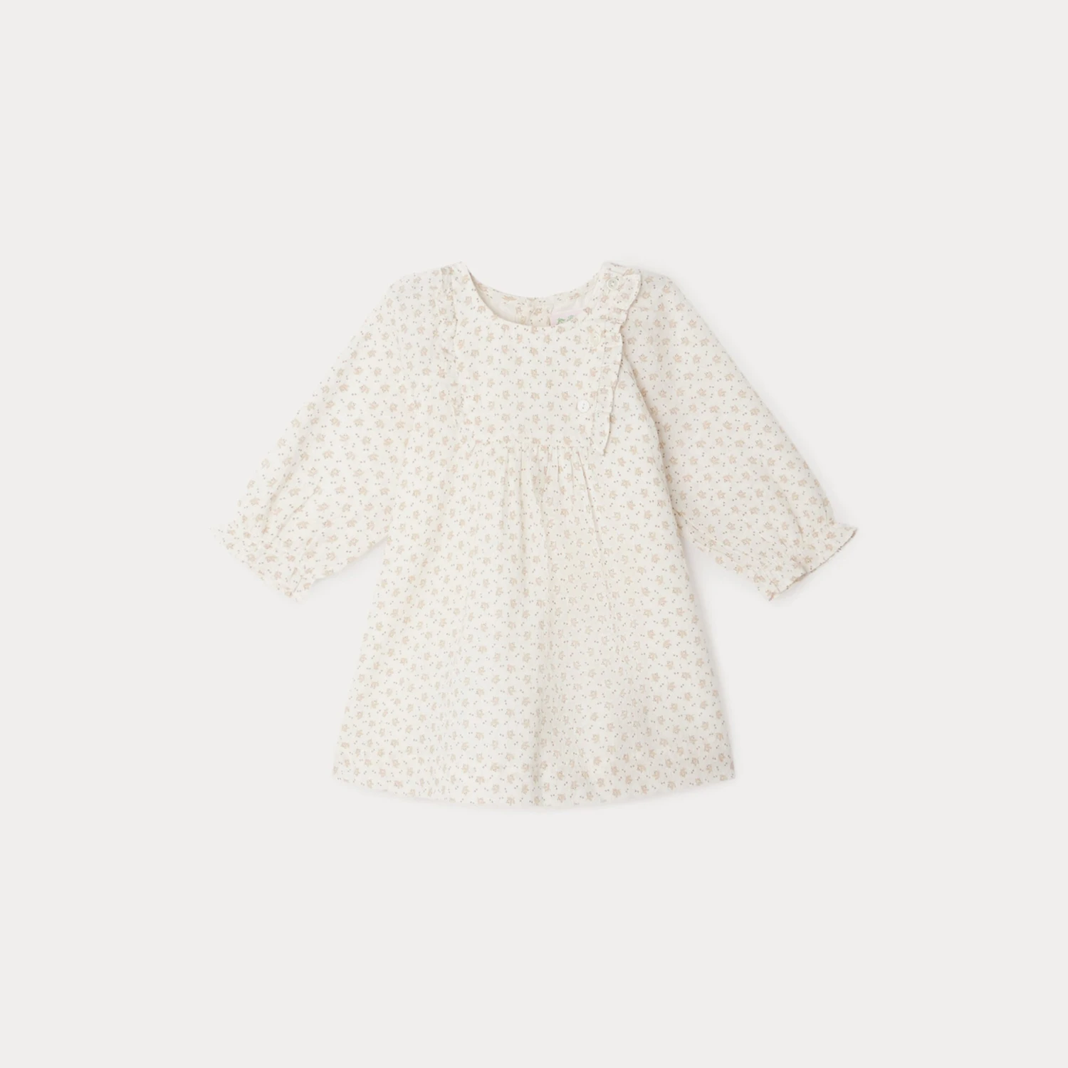 La robe Taelia pour bébé tire son charme de ses détails volantés sur l’empiècement devant et aux poignets. En tissu imprimé léger, elle est doublée en voile de coton pour plus de confort.