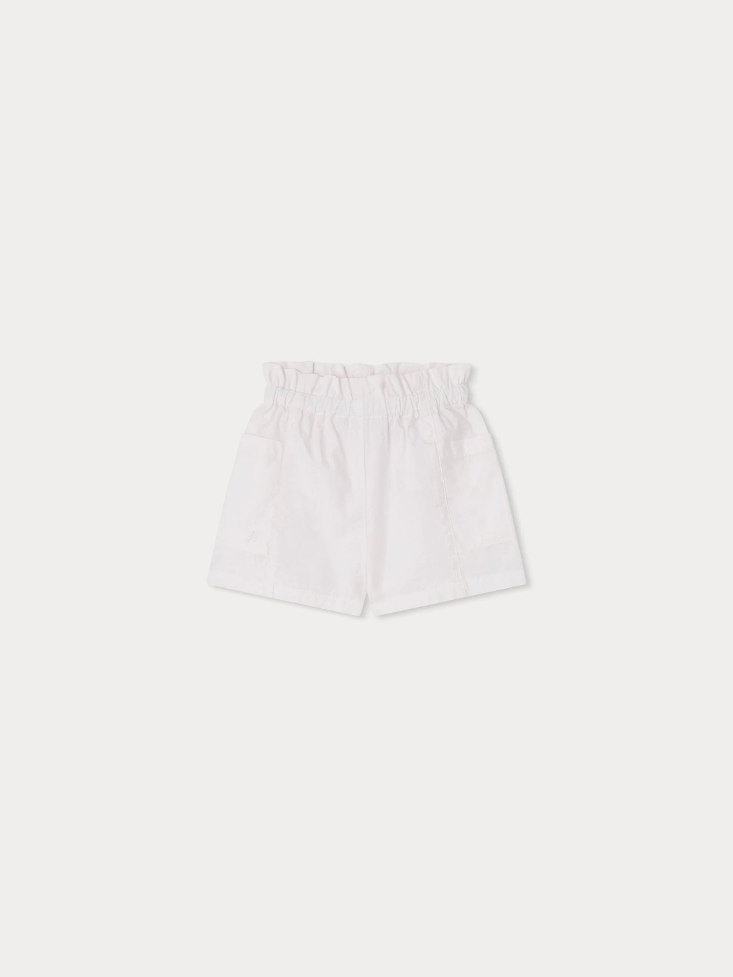 Le short Nougat pour bébé fille compose une tenue empreinte de délicatesse avec sa popeline surteinte et sa taille élastiquée à volants. Il possède deux poches plaquées sur les côtés.