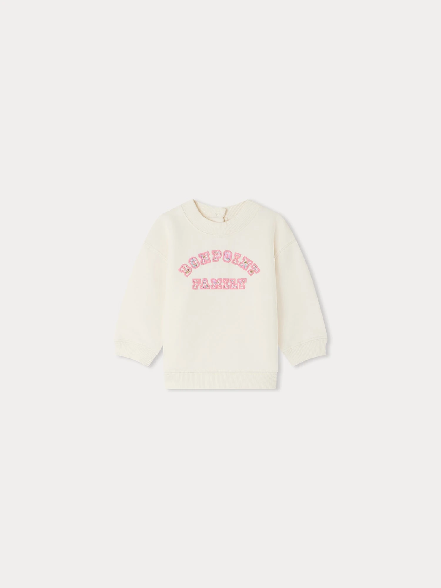 Ce sweat pour bébé Dahlia se démarque avec son imprimé « Bonpoint Family » placé à l’avant. Confectionné en molleton de coton biologique, il comporte des boutons au dos pour un enfilage facile.