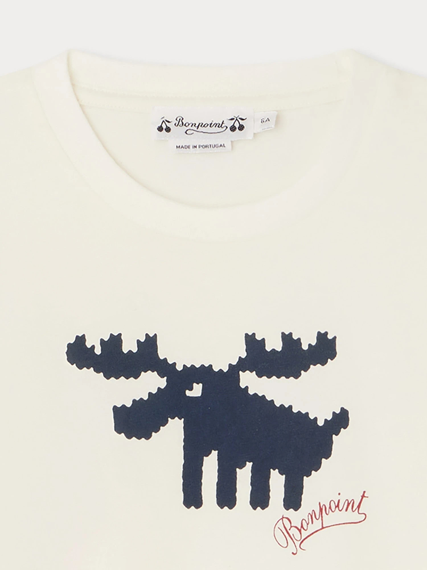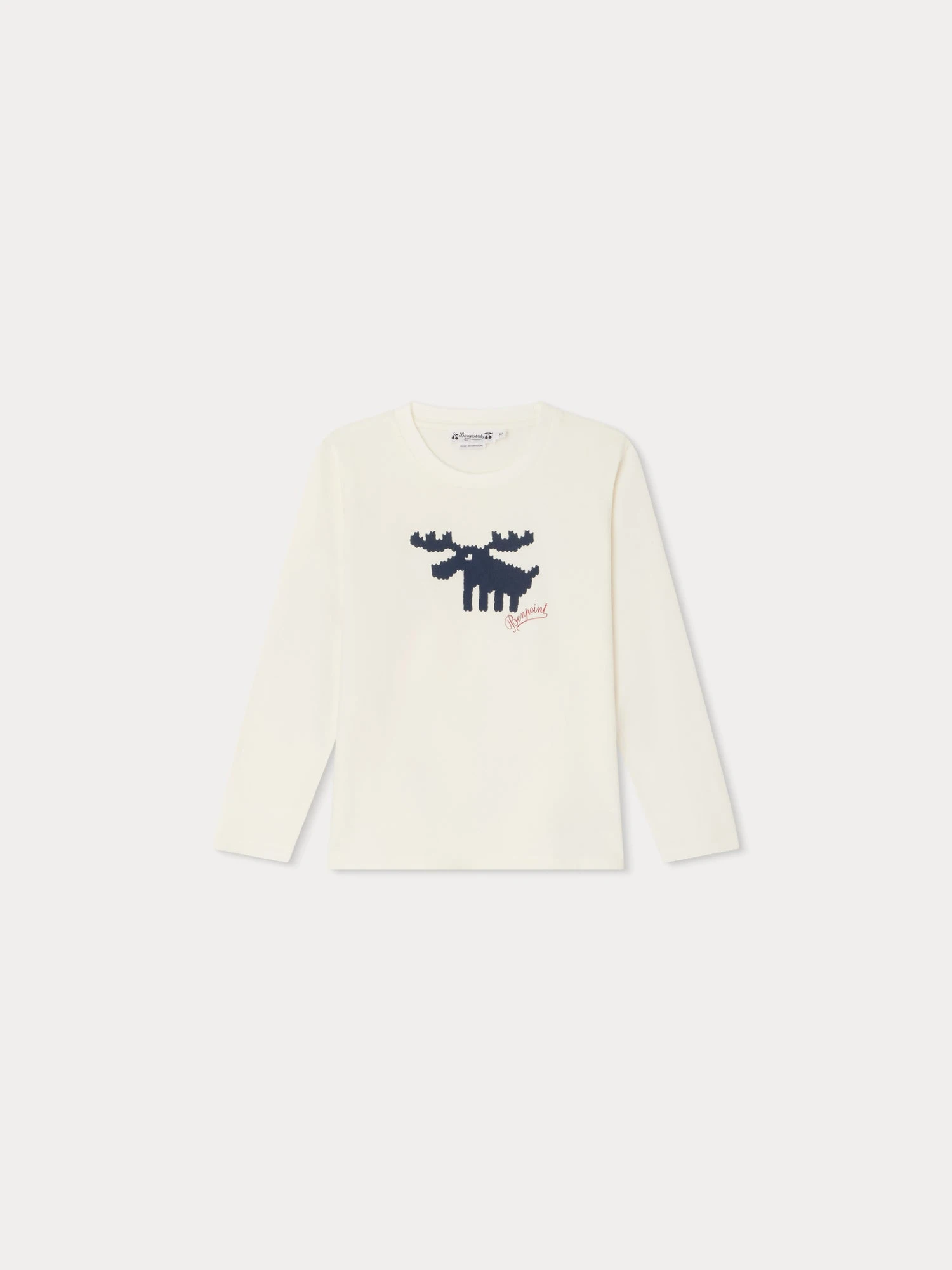 Animal emblématique de Noël, un renne imprimé occupe le devant du t-shirt Tadda pour garçon. La signature Bonpoint crée un léger contraste coloré sur ce modèle à manches longues.