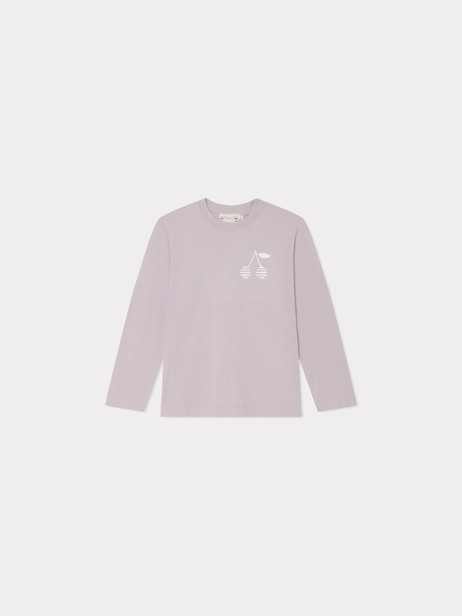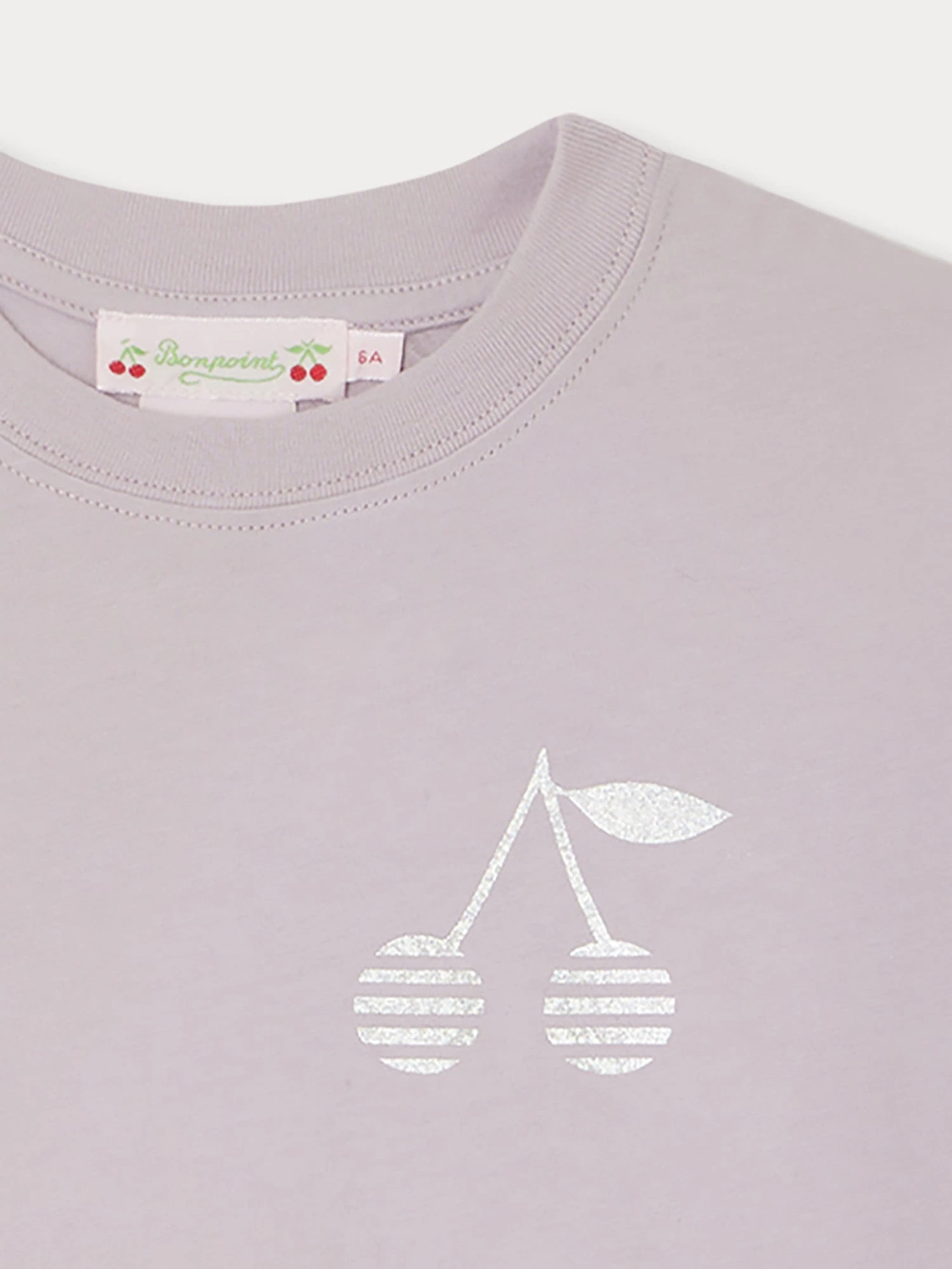 Le t-shirt Theia pour fille revisite la cerise iconique avec son imprimé contrastant à rayures sur la poitrine. Ce modèle droit est coupé dans un coton doux issu de l’agriculture biologique.