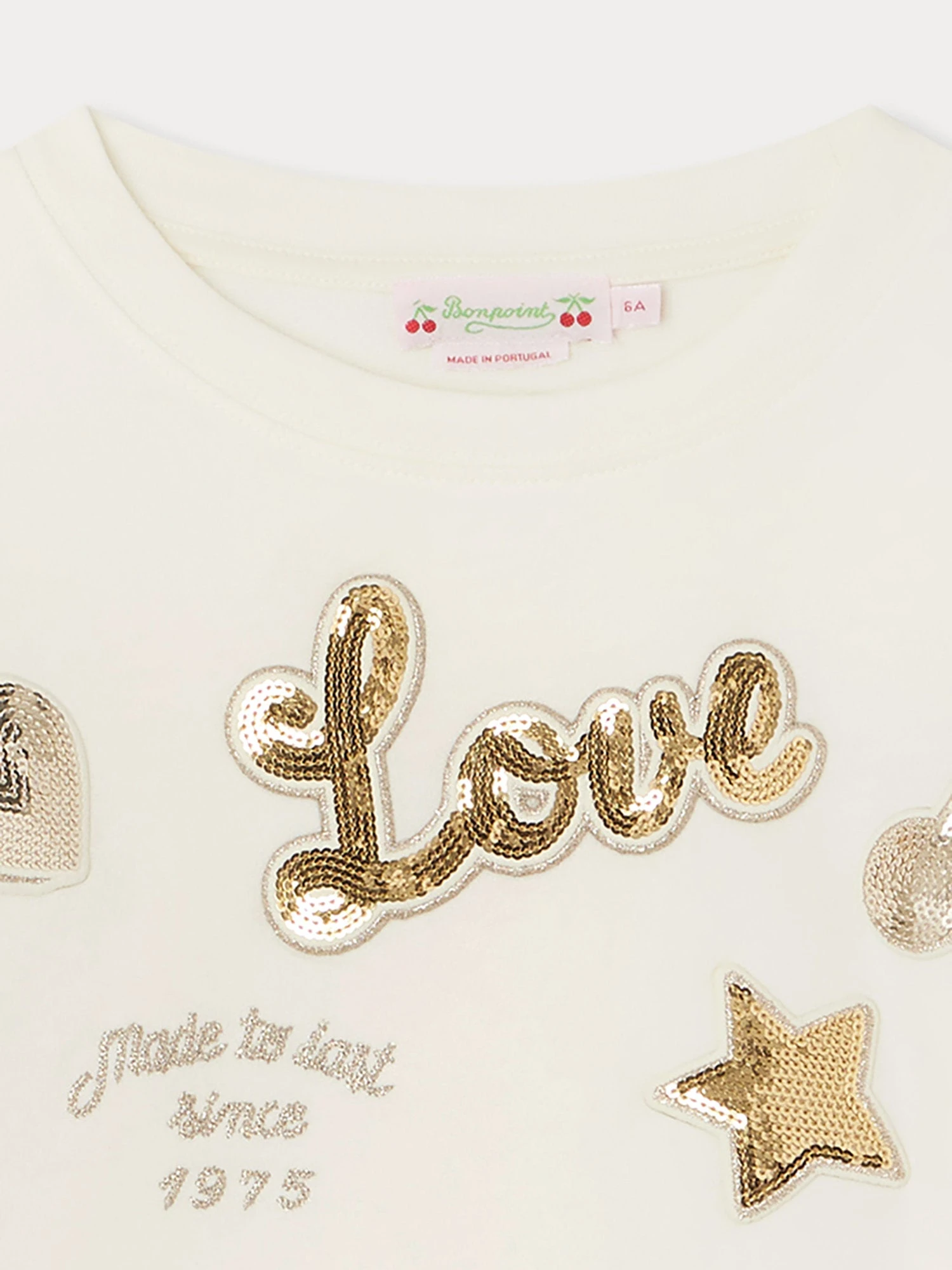 Le t-shirt Tien pour fille s’orne de plusieurs broderies et patchs à sequins sur l’avant : étoile, cœur, cerise… Ce modèle en jersey doux est conçu en coton issu de l’agriculture biologique.