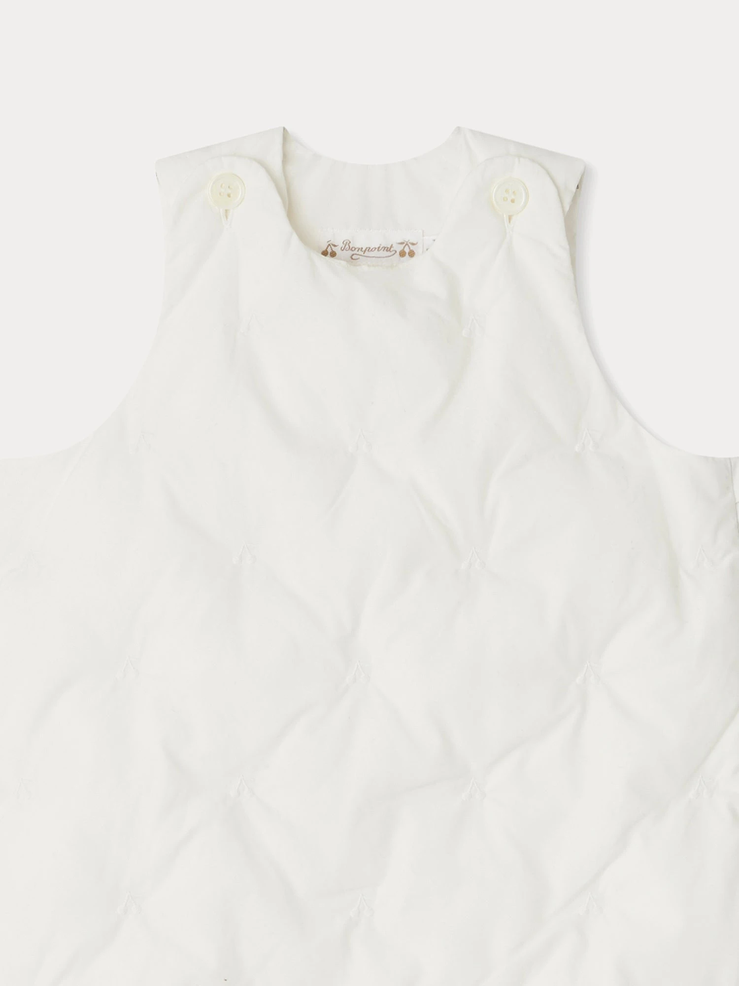 Cette turbulette pour bébé Joujou se démarque par son matelassage en forme de losanges, rehaussé de broderies cerises Bonpoint en ton sur ton. Elle est confectionnée en coton biologique.