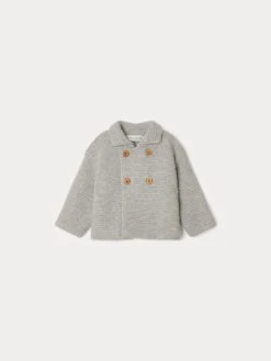 La veste Aalya garde les bébés bien au chaud avec sa maille au point mousse en laine et coton mélangés. Elle se ferme par un joli double boutonnage contrastant pour un effet croisé.