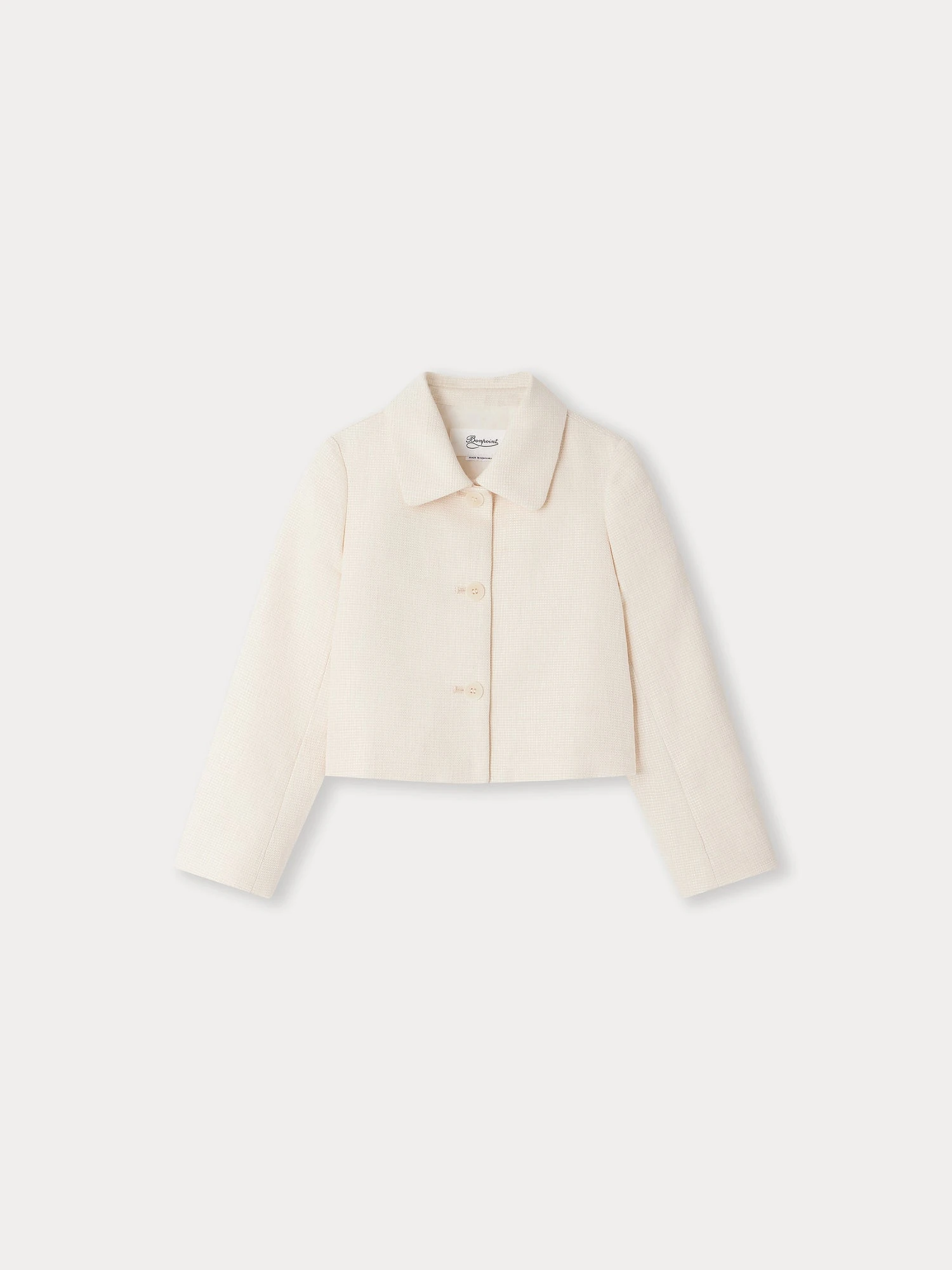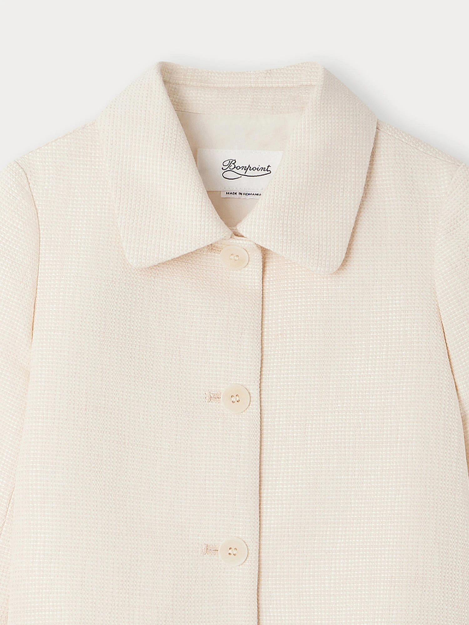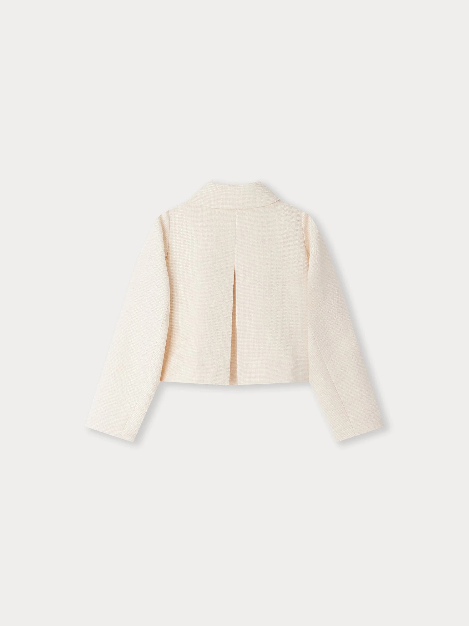 Avec une coupe légèrement trapèze, la veste habillée Fancy pour fille en piqué se distingue par un pli creux au dos. Agrémentée d’un col chemise, ce modèle court se ferme par trois boutons nacrés.